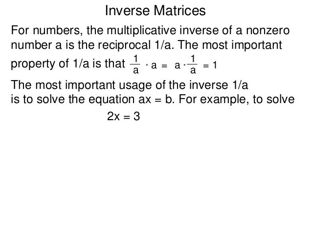 Multiplicative inverse of 3 since 1 3 3 1 Now consider the linear system The inverse of a matrix Exploration Lets think about inverses first in the context of real num-bers. Another property is that when a matrix M is multiplied cy its inverse M -1 the product is the identity I. The inverse of the matrix A is written as A-1 then.
